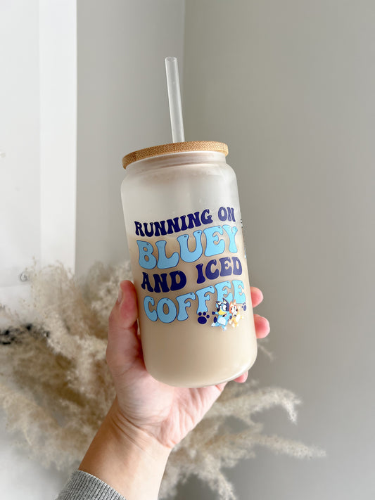 Running On Bluey and Iced Coffee 16oz Glass Can With Bamboo Lid - Bear and Moo UK