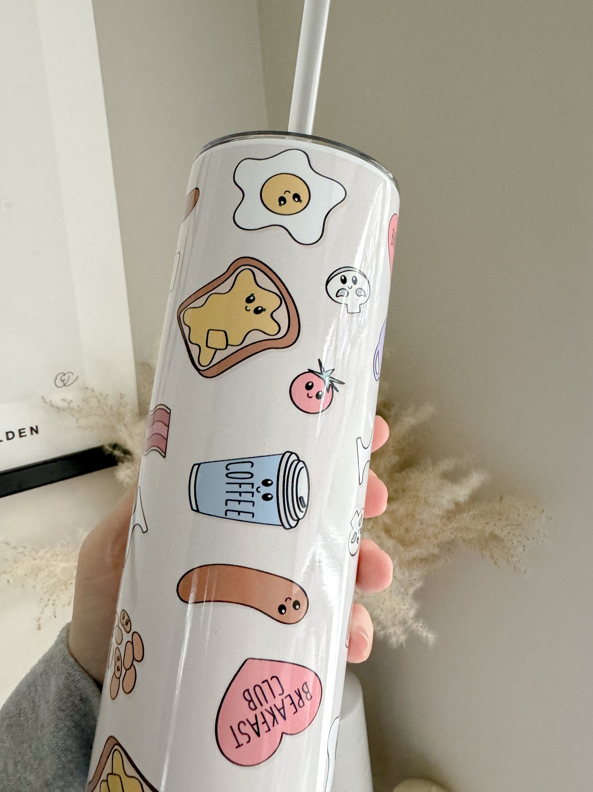 This super cute 20oz stainless steel tumbler is perfect for anyone looking for a pop of colour in their drinkware. Featuring a super cute design of kawaii inspired breakfast foods on a neutral background.