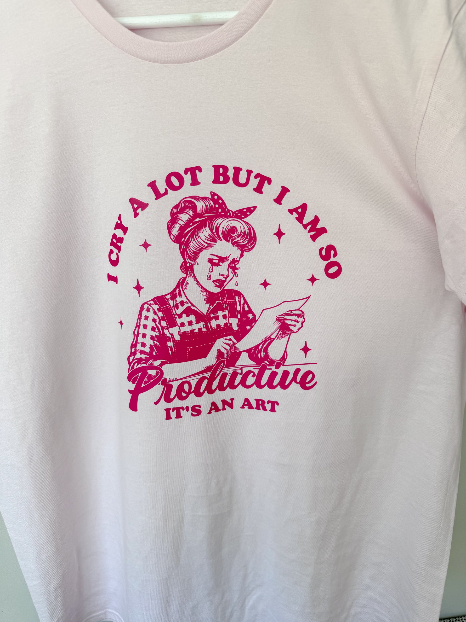 Our unisex range features super soft tshirts that are 80% ringspun cotton and 20% polyster. This design includes retro style 'I cry a lot but I am so productive, it's an art' with a woman crying. Slightly oversized and still lightweight for maximum comfort.
