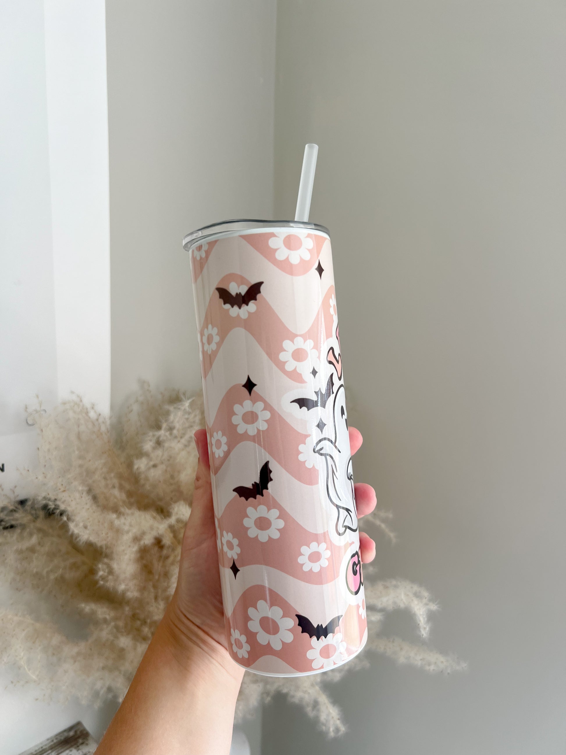 This listing is for a 20oz stainless steel tumbler featuring a wrap around image of dancing ghouls, flowers and bats with the text 'Let's Go Ghouls', perfect for any Halloween lover or someone who is into spoopy Halloween (Or just Shania Twain) The stainless steel tumbler is perfect for hot and cold drinks. Keeping drinks cold for up to 12 hours and warm for up to 8. The tumbler is also leakproof when the lid is completely sealed (no straw in the opening). The tumbler comes with a straw and BPA free lid that features a slide opening where you can either drink straight from the tumbler or use a straw. Unlike our other products, this is printed with ink into the coating, meaning that the images cannot transfer or lift.