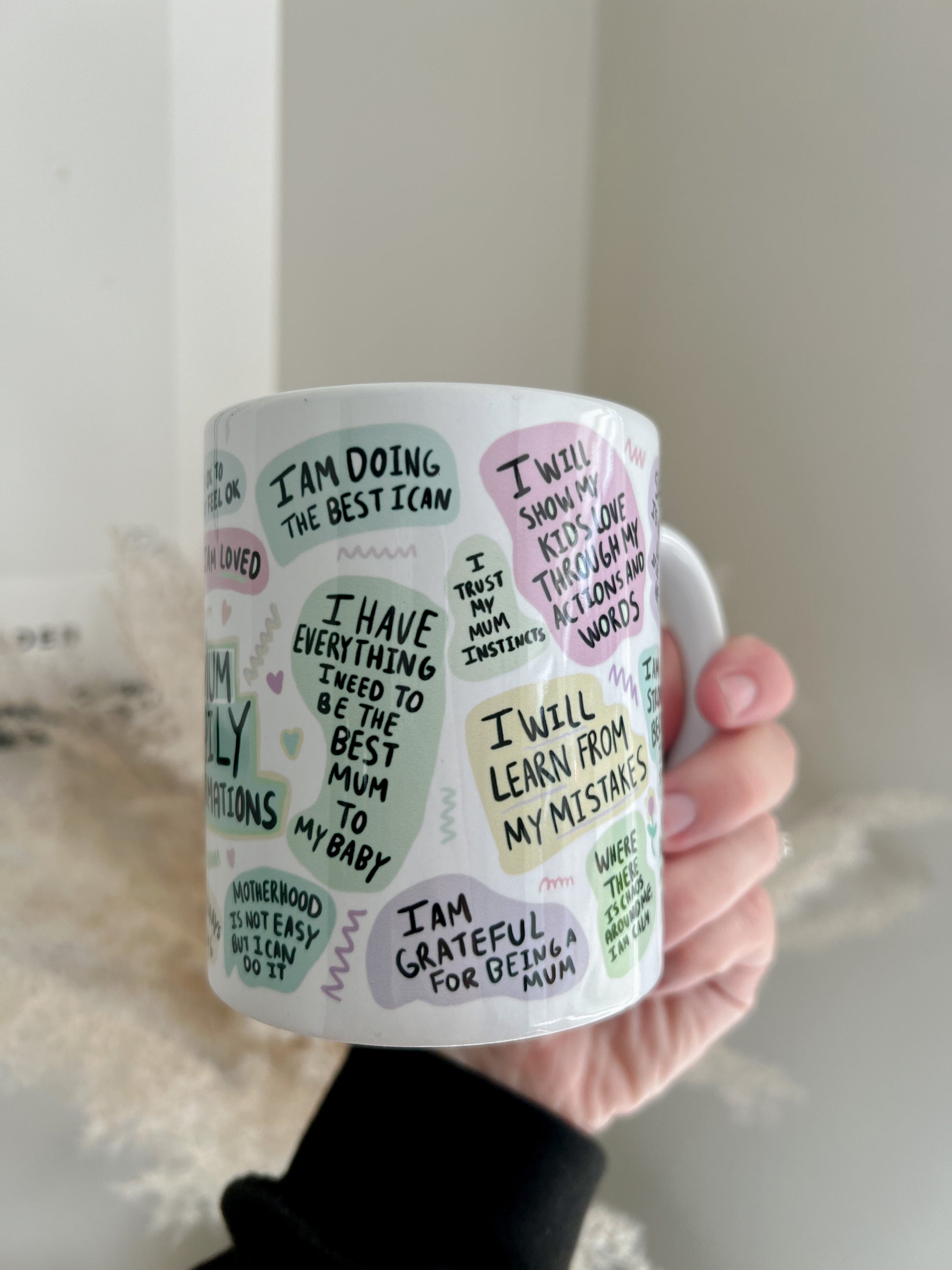 This listing is for the 11oz Mum Daily Affirmation Mug. Ideal for new mums, mums to be, 2nd time mums and beyond, sprinkle a little bit of positivity in their coffee or hot drink of choice with this super cute mug. Featuring various positive affirmations and quotes for mums.