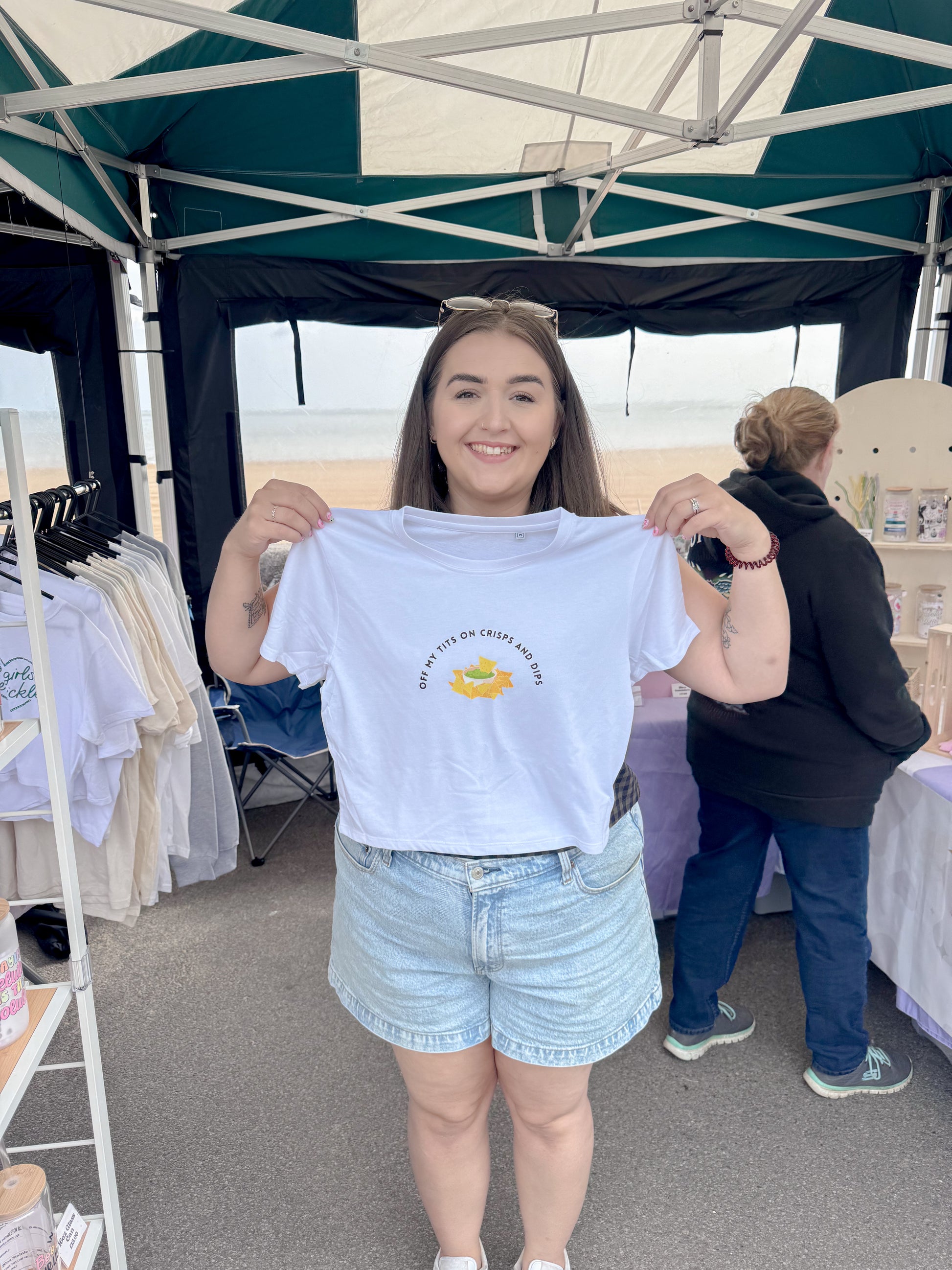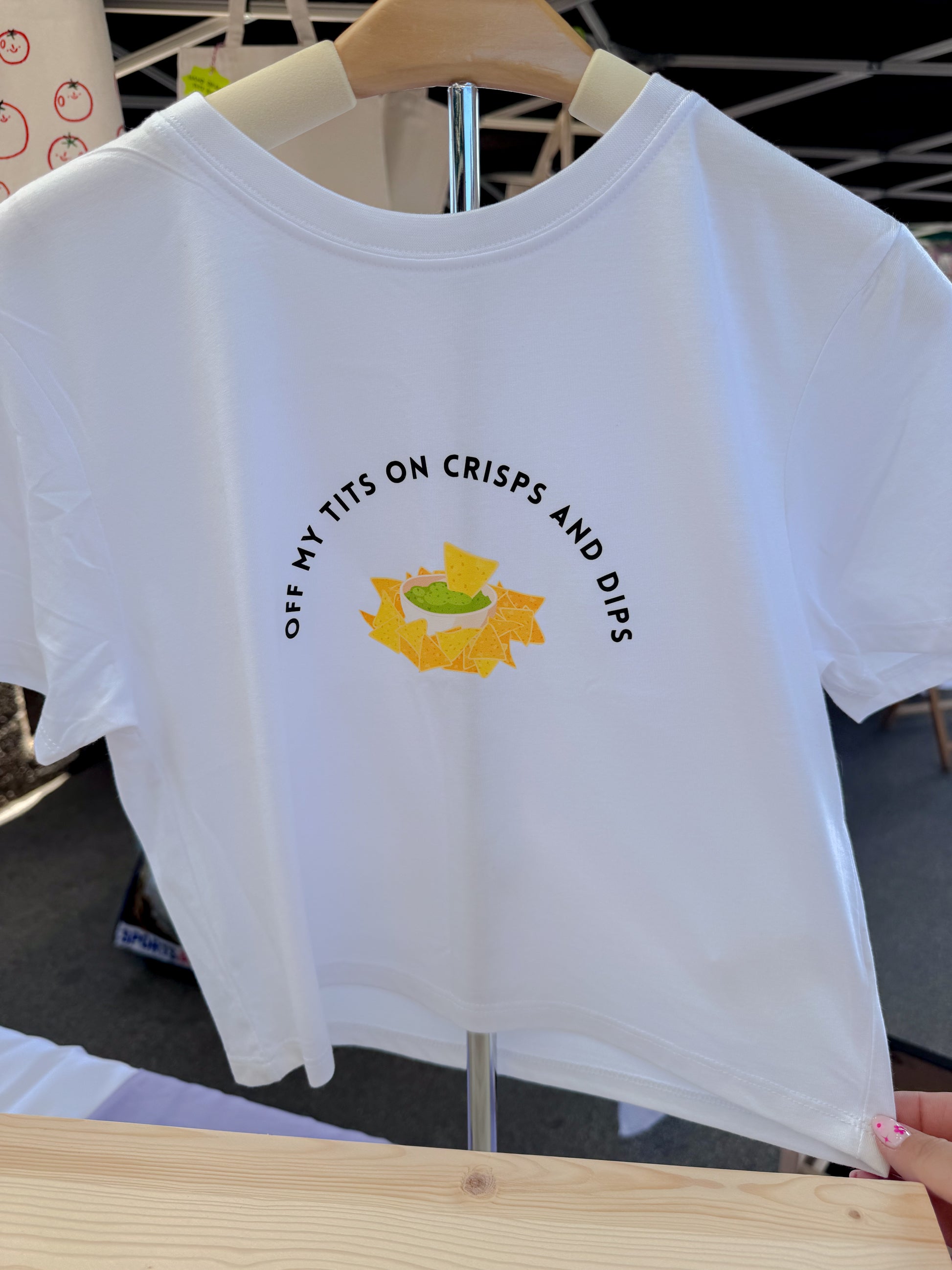 Off my tits on crisps and dips! The baby tee of the summer! Perfect for anyone who loves a picky tea or a girl dinner. These baby tee crop tops are super soft and go from a size XS-XL (up to approximately a size 16/18 depending on how you like your tees to fit).