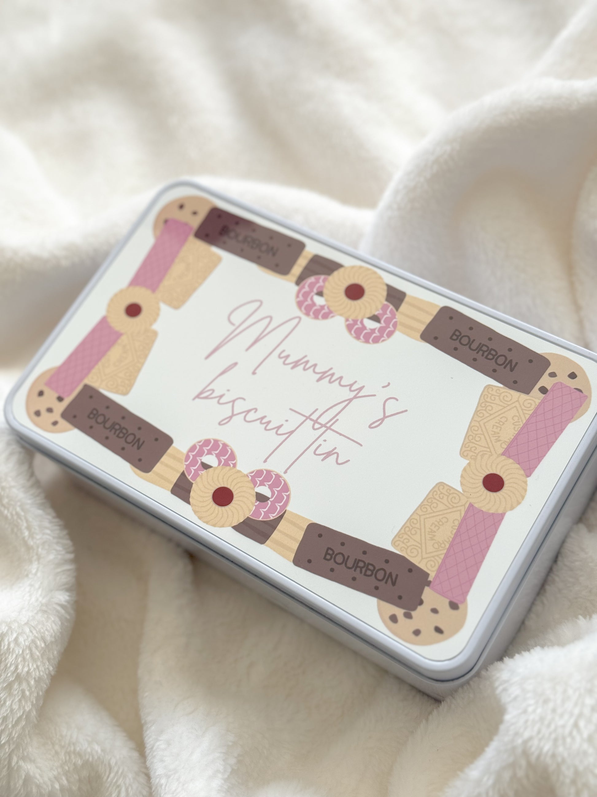 Featuring a super cute biscuit border and text '_____ biscuit tin' the colour of the text can be changed, please state this in the personalisation box otherwise, the text will be in the standard pink shown.