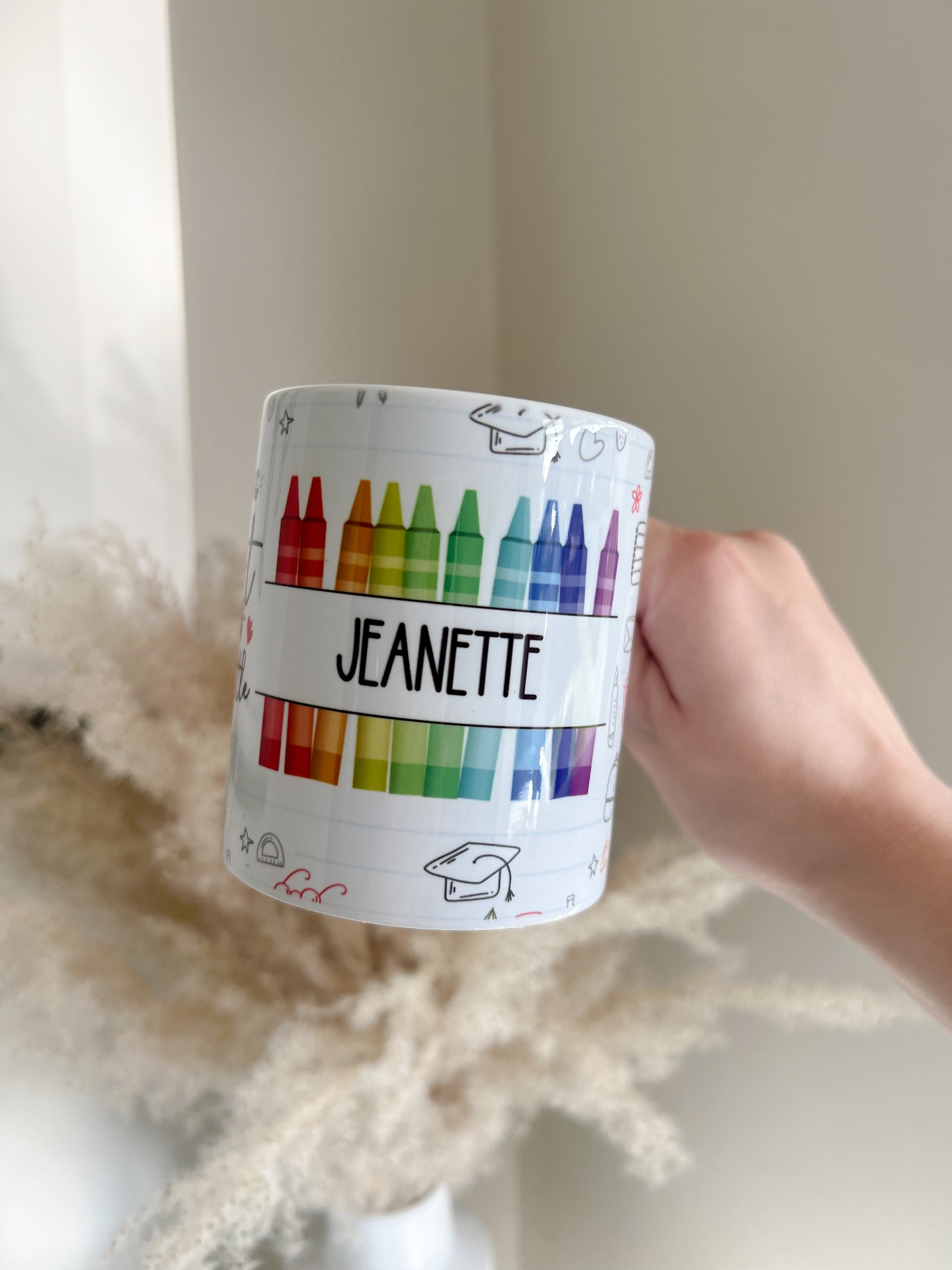 If you're looking for a perfect thank you gift for your teachers or teaching assistants, look no further! The personalised ceramic mug is the perfect gift. Whether it's for home or office use, this will stand out on anywhere. This makes a great pairing with our best selling personalised teacher cold cup. This mug features a full wrap around image of various school items, including bags, glasses, rulers etc, one party has crayons with name personalisation and another part of the full mug wrap has the lovely quote 'it takes a big heart to teach little minds'.