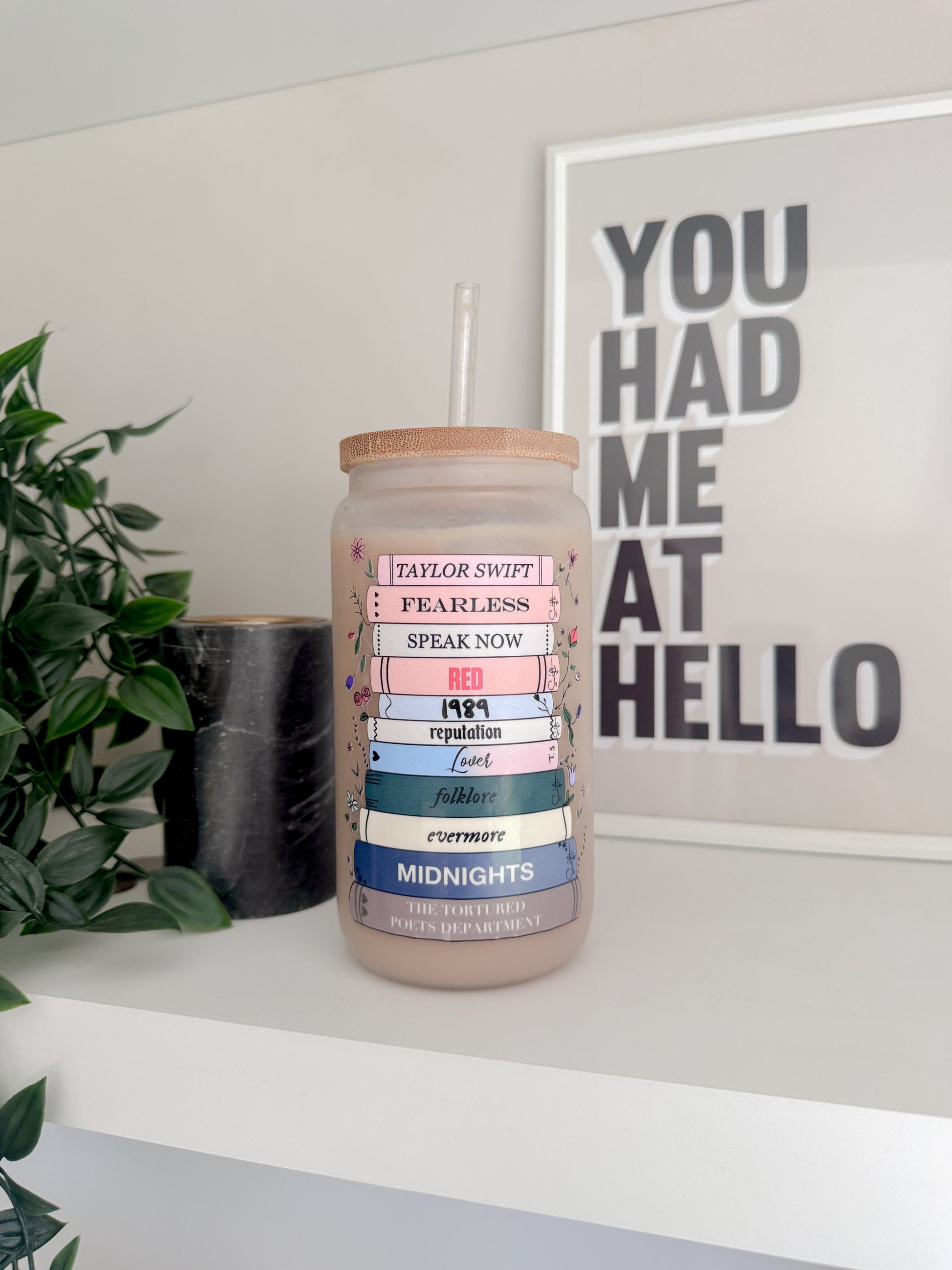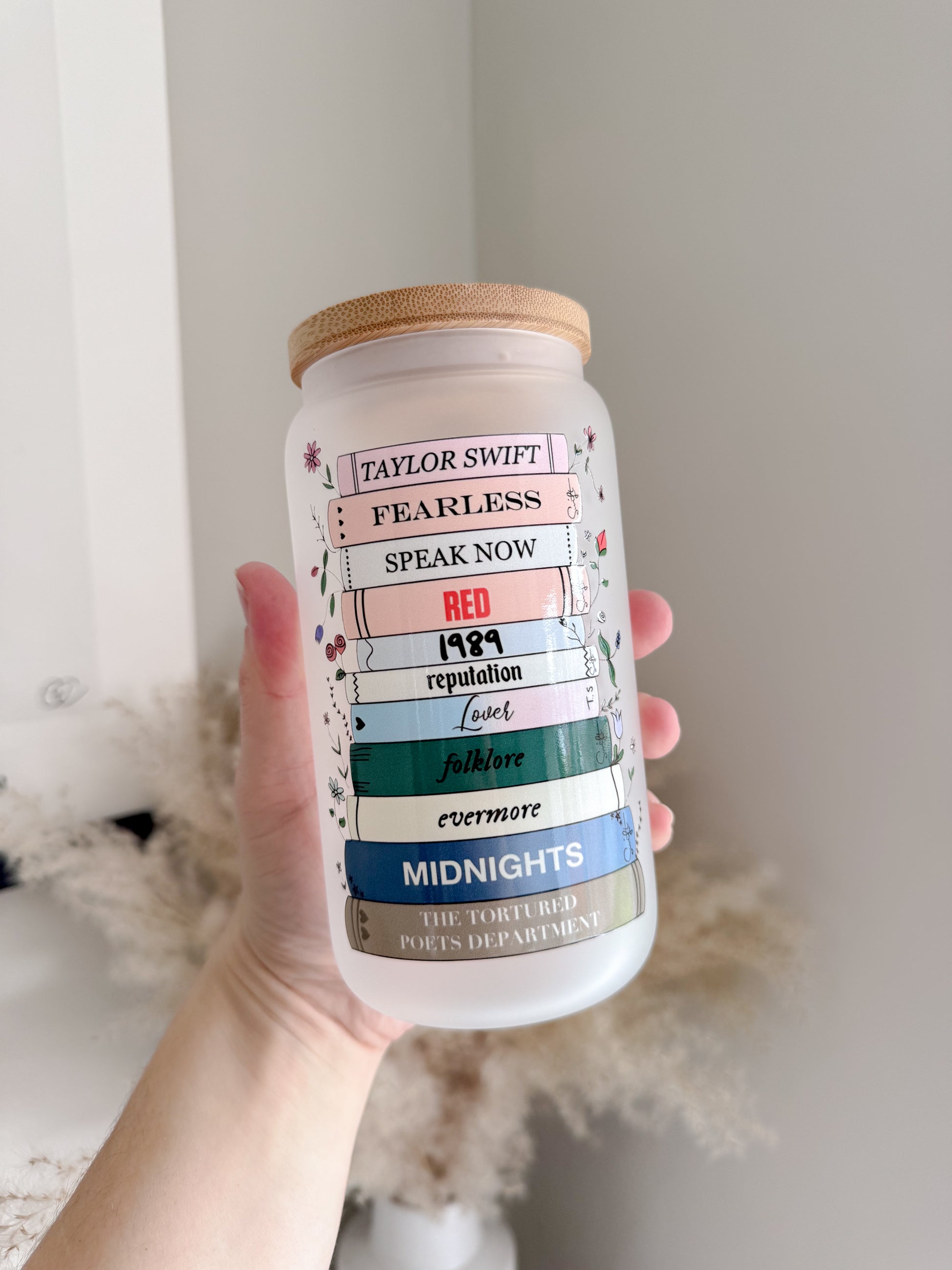 Our best selling product in 2023 and 2024 has now been updated to include the latest era TS12- The Life Of A Showgirl! - the Eras Inspired 16oz Glass Can with bamboo lid and straw. The Swiftie inspired glass can is perfect for iced coffees, soft and warm drinks. The glass cans with bamboo lid and straw should be on everyones wishlist! Available in both frosted and clear glass cans. Each glass holds 16oz of liquid (approximately 450ml). Perfect for any Taylor Swift fan or fellow Swiftie. Waterproof and scratch resistant! (But please do not put it in the dishwasher or leave to soak as this can cause the decal to lift!)