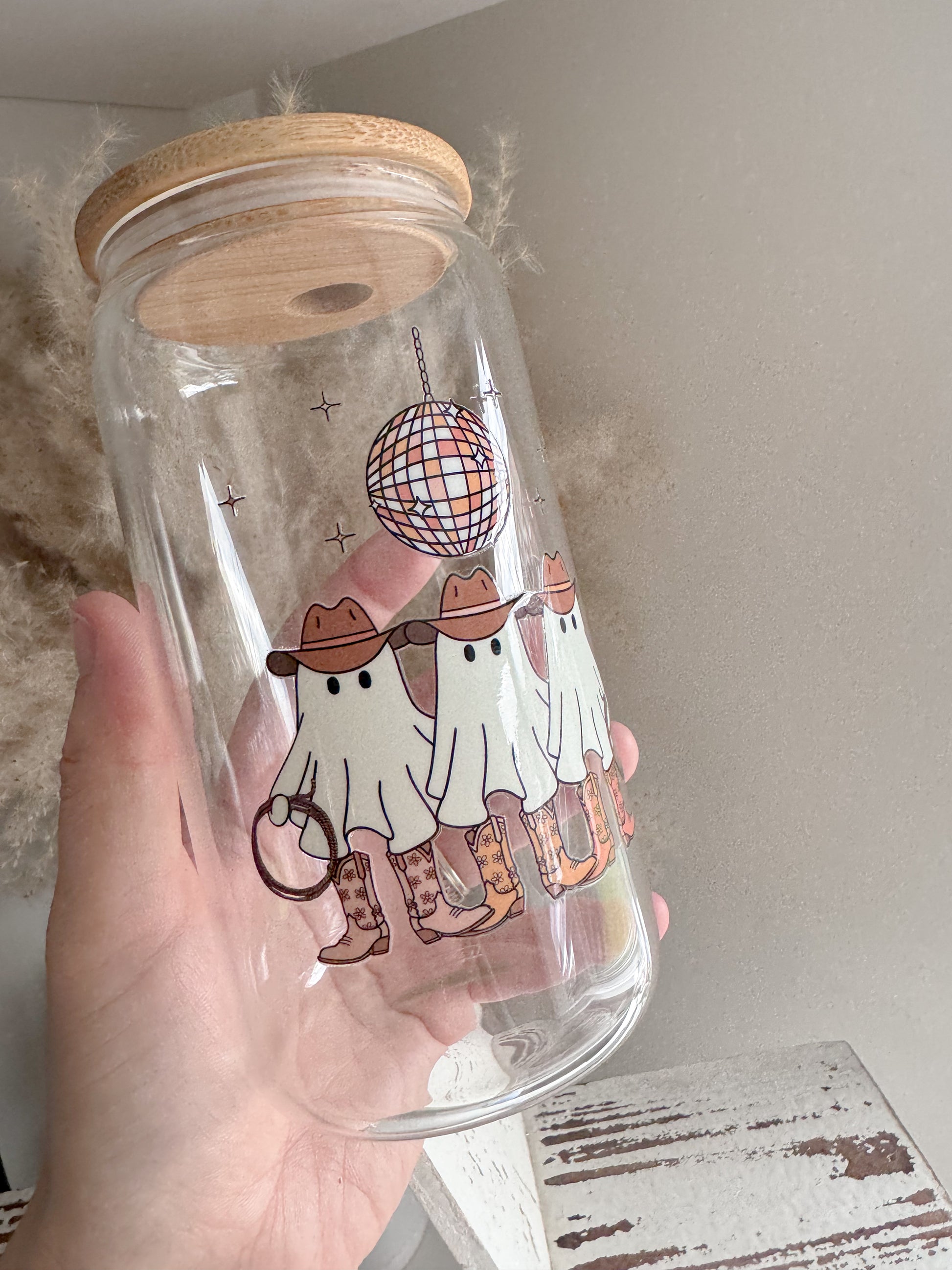 Perfect for iced coffees, soft drinks, alcohol, hot drinks - you name it! The glass cans with bamboo lid and straw should be on everyones wishlist! Available in both frosted and clear glass cans. Ideal for coffee lovers. Iced coffees in the summer, lattes in the winter. Each glass holds 16oz of liquid (approximately 450ml). The design is cute and funny, featuring a disco ball with three cowboy ghosties in boots and hats. Made using UVDTF to increase longevity of the product. Waterproof and scratch resistant! (But please do not put it in the dishwasher!).